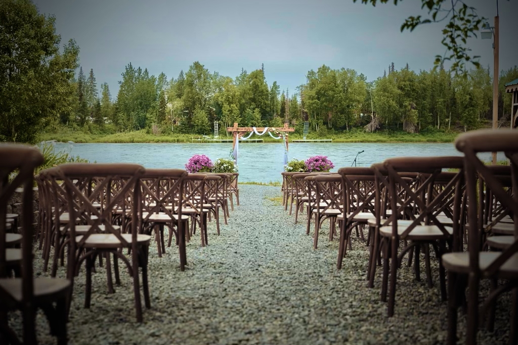 We are the newest wedding locale out and are dedicated to giving you a truly memorable 5 star quality venue that you & your family & loved ones will rave about and remember for a lifetime. From our huge sprucewood logs that are breathtaking which will leave you in awe upon arrival, to our flat lawn on the water’s edge that is unique to us as we are literally the ONLY wedding venue who can offer the bride and groom a place to say their vows directly on the bank of the Kenai River.