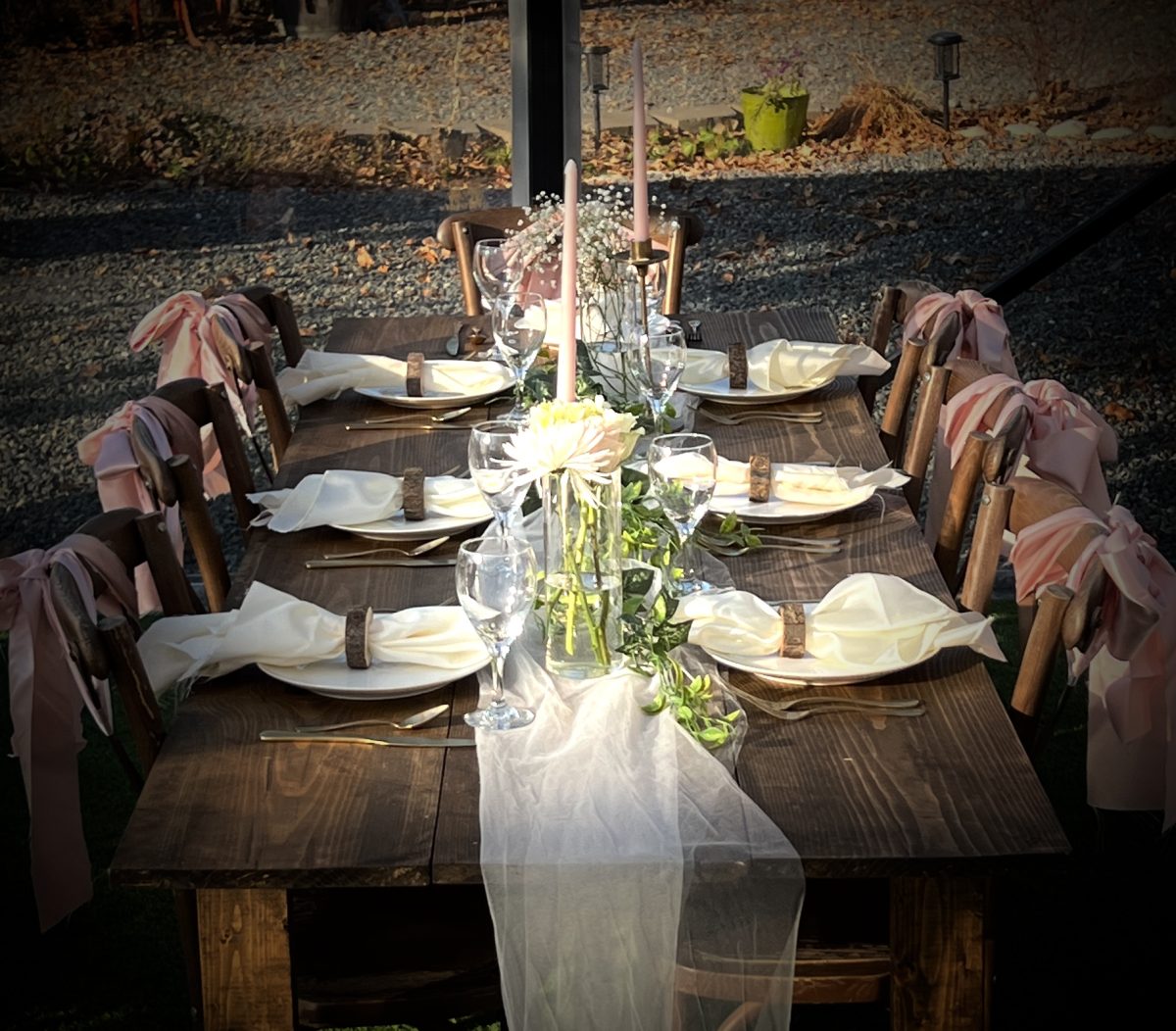 The free place settings come with 3 options for plates starting in 2024: a simple white plate, a white wavy plate with a gold rim, and a selection of floral vintage/antiques plates (that fits nicely on our wooden chargers). The cutlery will have 3 options as well: silver, matte gold, or rose gold. We will also provide steak knives, water glasses, champagne glasses, and one wine glass style (white wine). You can use red or white wine but it’s technically the white wine glass we have. (Just an fyi….Red wine glasses are fatter in girth so you can get your better red wines to “breath”). You can use white wine glasses no matter what color of wine you pour at at events. Besides that, not many of your guests will know the difference in Alaska, right? 🙂 These items do all need to be cleaned and put back where you found them. In 2023, I kept losing ALL champagne glasses! Not just one or two. Like ALL disappeared together. Do people throw these in the river for some ritual??? UH….RUUUDE…. 🙂 This is becoming a mystery!